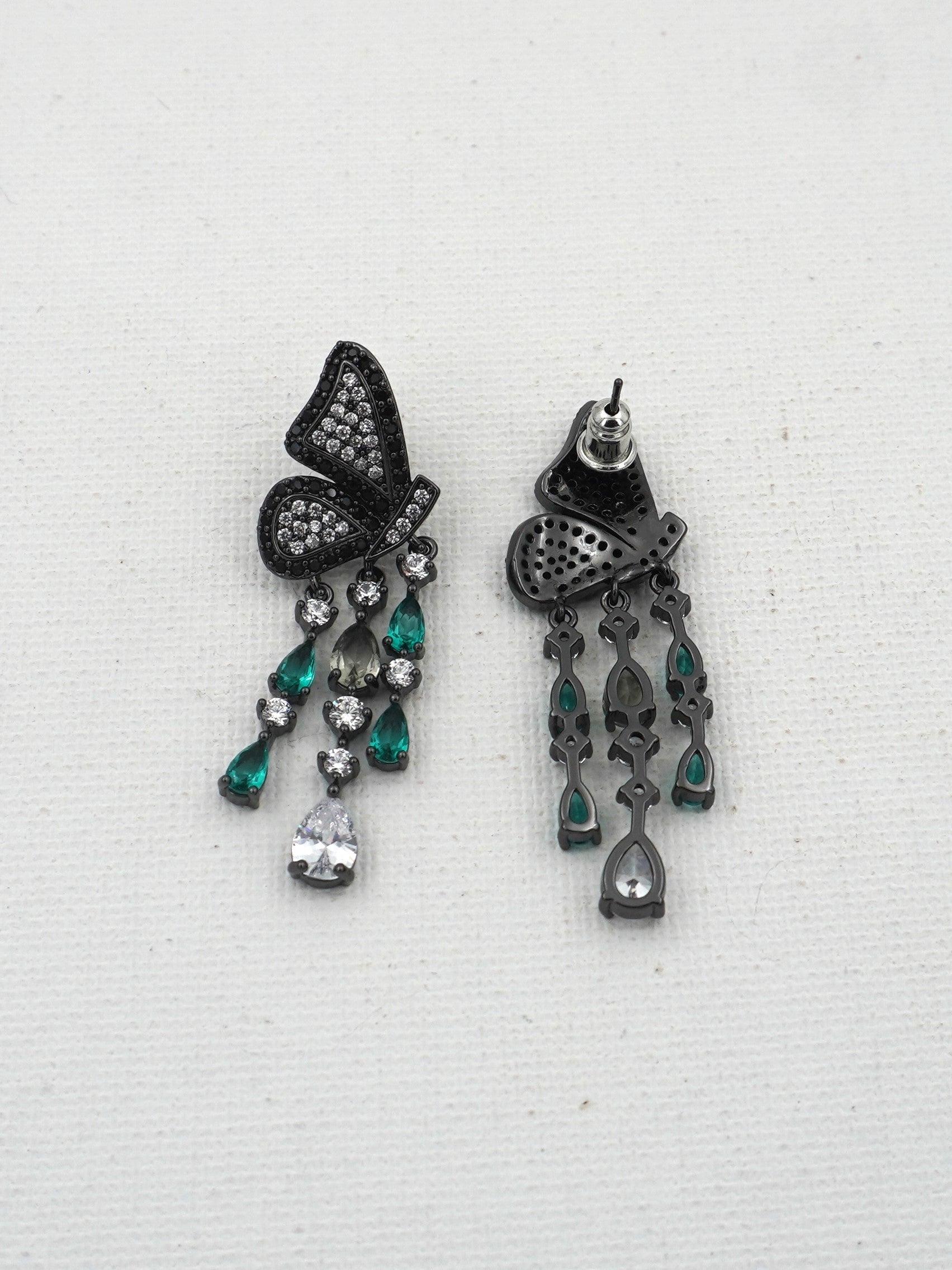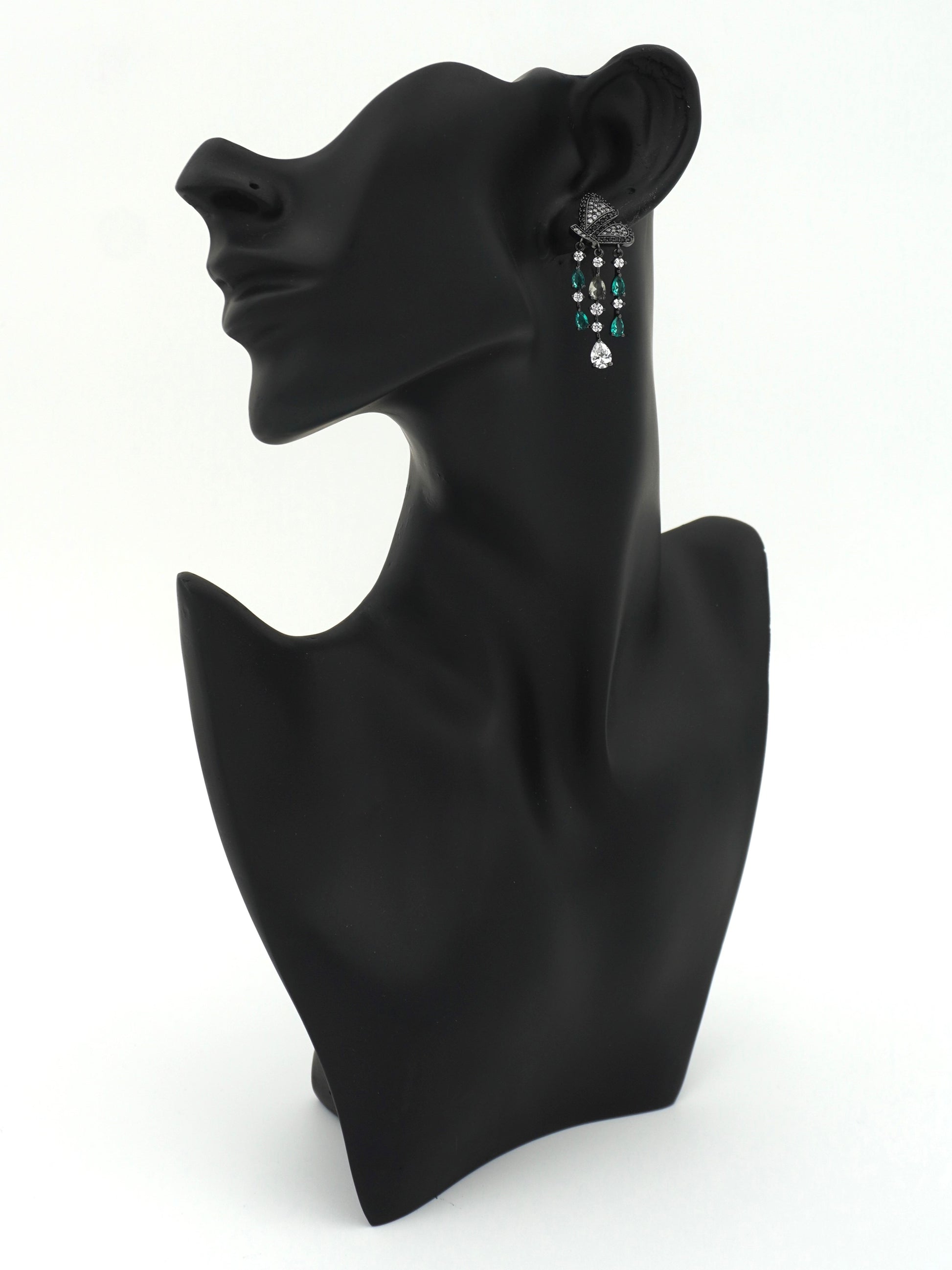 "Dangler earrings" are a type of earring characterized by a design that hangs down below the earlobe, creating a dangling effect. They are typically attached to the earlobe with a stud or hook and feature a decorative element that extends below the earlobe. Dangler earrings come in various styles, lengths, and designs, ranging from simple chains or single gemstones to more elaborate designs with multiple components such as beads, charms, feathers, or intricate metalwork. They are popular for adding movement and a stylish accent to an outfit, often worn for both casual and formal occasions depending on their design and materials.