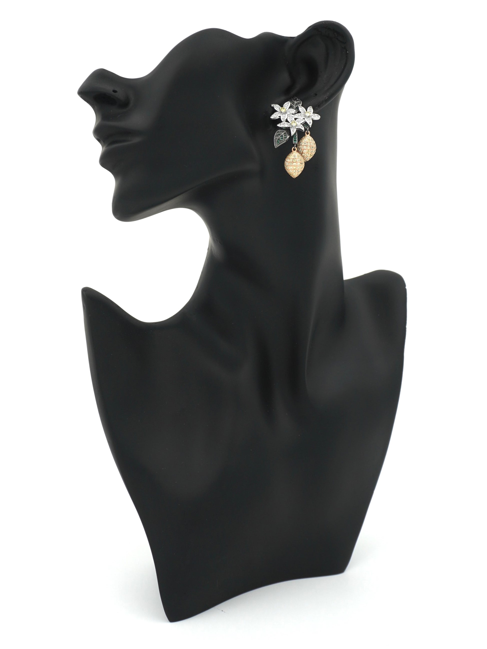 "Dangler earrings" are a type of earring characterized by a design that hangs down below the earlobe, creating a dangling effect. They are typically attached to the earlobe with a stud or hook and feature a decorative element that extends below the earlobe. Dangler earrings come in various styles, lengths, and designs, ranging from simple chains or single gemstones to more elaborate designs with multiple components such as beads, charms, feathers, or intricate metalwork. They are popular for adding movement and a stylish accent to an outfit, often worn for both casual and formal occasions depending on their design and materials.
